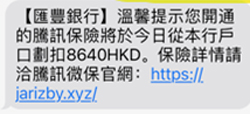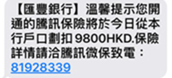 The Hongkong and Shanghai Banking Corporation Limited would like to alert its customers to phishing SMS purported to be from HSBC. The phishing SMS claims that a premium payment for an insurance policy will be deducted from their bank account and suggests customers to call or to click on a link for details.