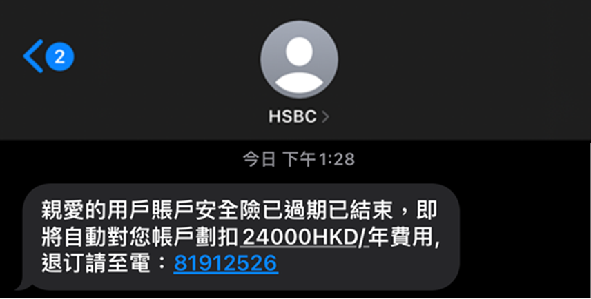 香港上海滙豐銀行有限公司提示客戶慎防偽冒滙豐的短訊。有關短訊訛稱會由客戶的銀行戶口中扣除一份保險的保費,並建議客戶致電聯絡或點擊超連結以了解保險詳情。